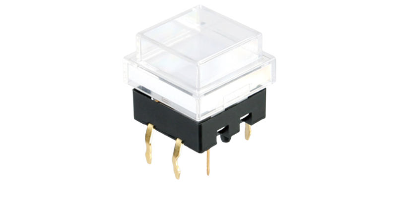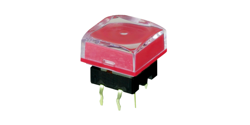 A 12mm square-cap tactile switch featuring a clear click feel, single-color or bi-color LED illumination, and full-face light-emitting functionality.