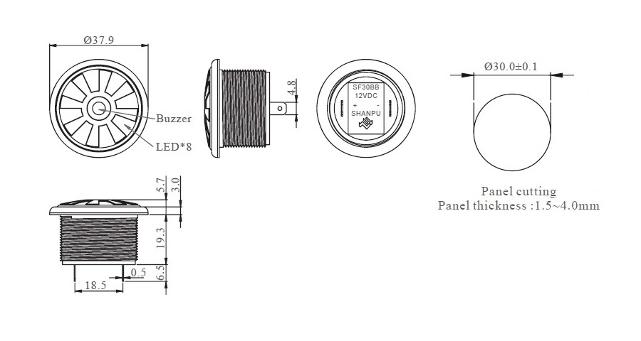 SF30BB圧電ブザーインジケーターの使い方は? パネルの厚さは1.5mm~4.0mmで、切断径は30mm±0.1mmです。ナットで締め付けてください。