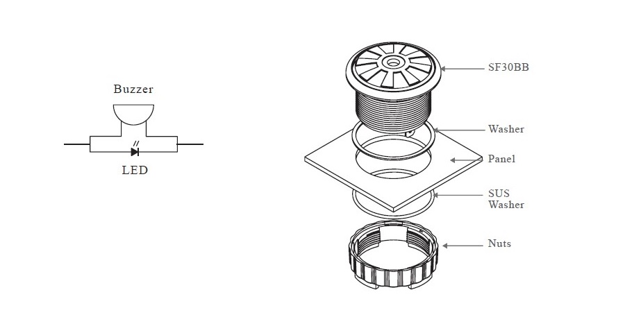 付属品にはワッシャー、SUS ワッシャー、ナットがあり、下の図に従って SF30BB ブザー インジケーターを設置します。機器に接続する端子ピンが 2 つあります。