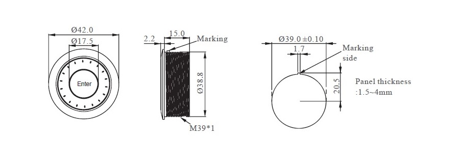 平面ロータリーエンコーダとプッシュボタンスイッチを組み合わせたモジュラー設計は、ねじ付きアルミ合金フレームに収納されており、耐久性と設置性が向上しています。パネル開口部の直径は39±0.1mm、スイッチ全体の直径は42mmです。