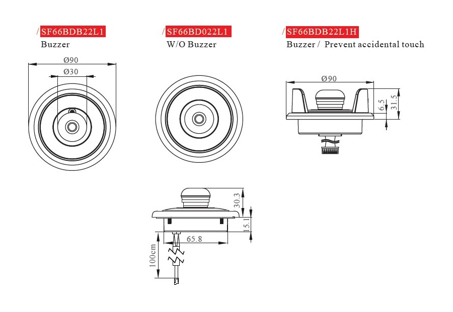 SF66BDの取付穴径は66mm、外径は90mmです。ブザー付きとブザーなしは同サイズです。誤タッチ防止フレーム付きのタイプもございます。