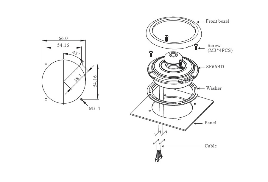 SF66BD は、リング照明とブザーアラームを備えた IP65 緊急停止スイッチです。パネルカット径は 66 mm です。取り付けるには下の図に従ってください。