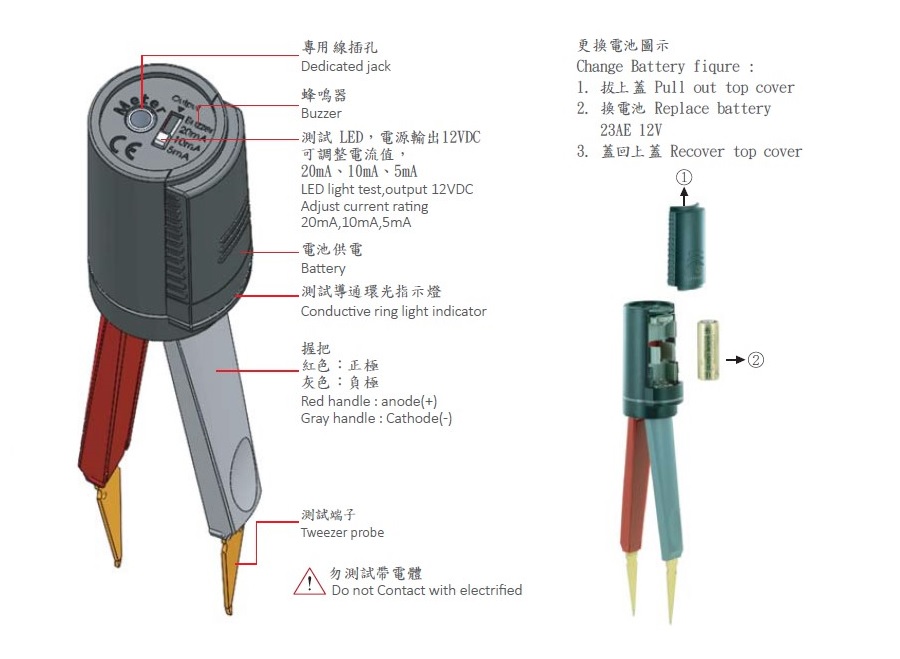 このテストピンセットは、リングLEDやブザーを検査することで、プッシュボタンスイッチの接点、リレー、ヒューズ、配線などの導電性接点の断線や短絡を検査するために使用できます。