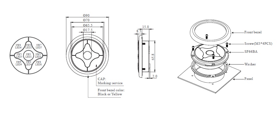 SF66BA九路可編程開關採用6 pins接點設計,對應VCC、CS、DOUT、GND、DIN與SCLK等功能,可透過4線SPI介面與主控制板高速且穩定通訊。其清楚的接腳定義有助於簡化佈線與系統整合,讓工程師更易於部署於多按鍵輸入模組或人機介面設備。此外,SF66BA 採用Ø66mm標準面板開孔尺寸,適合安裝於工業控制面板、醫療設備與智慧終端,使整體設計更具一致性與安裝便利性。