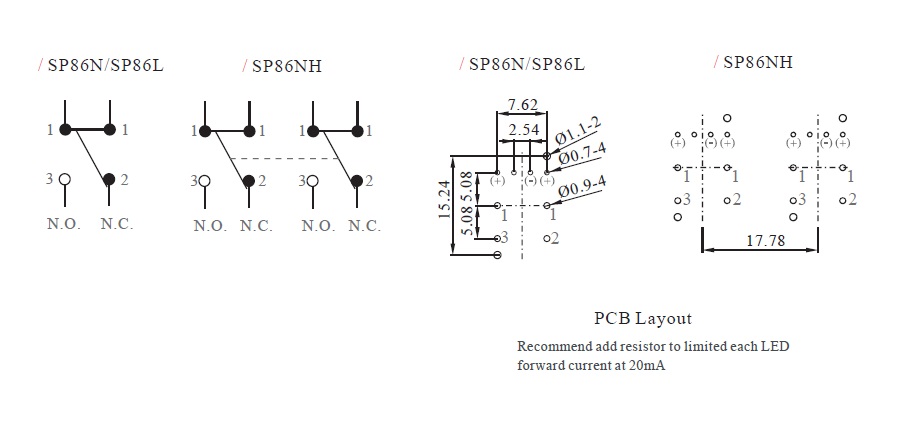 SP86L與SP86N具備相同外觀尺寸與腳位間距,僅內部機構功能不同,可於同一電路板上依需求選擇瞬時或帶鎖型。