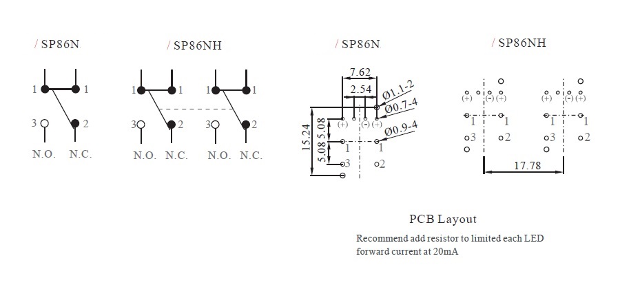 SP86的SPDT接點結構讓單一按鍵即可進行訊號切換,工程應用中可依功能需求選擇NO或NC腳位。其LED腳位與控制接點分離設計,方便在 PCB 上獨立佈線,提升電源與訊號配置的穩定性。