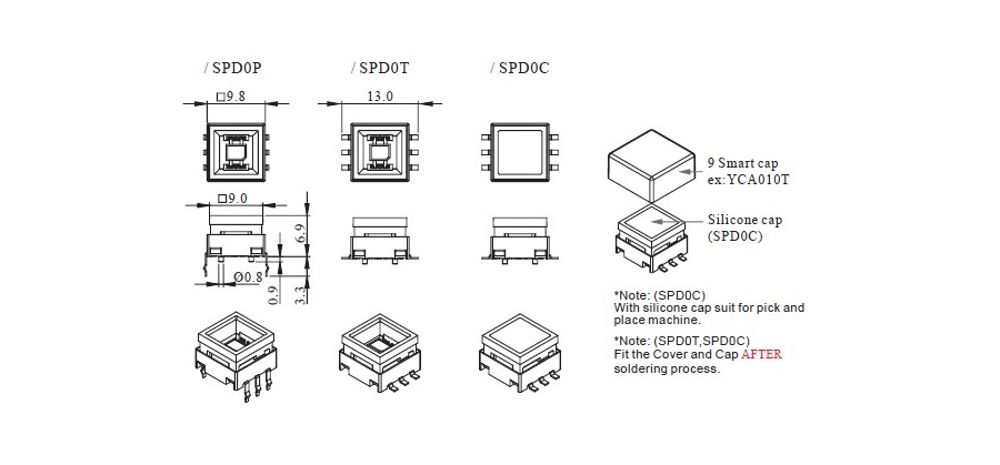 SPD0是SPD系列其中一款,它的作動鈕尺寸是正方形9×9mm,可以搭配尚圃9聰明帽蓋系列。它有插件腳(TH)和貼片式(SMD)兩種端子腳型式。