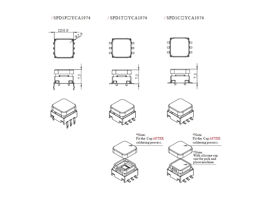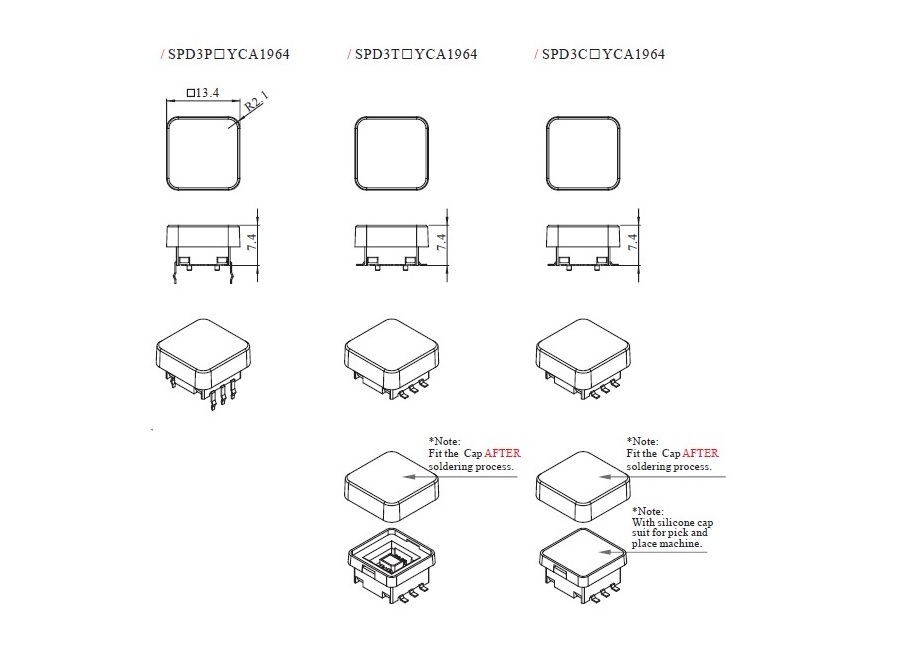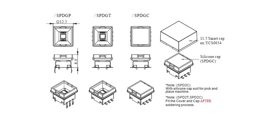 SPD3是SPD系列其中一款,它的作動鈕是正方形帶圓角,只能搭配尚圃YCA1964帽蓋。它有插件腳(TH)和貼片式(SMD)兩種端子腳型式。