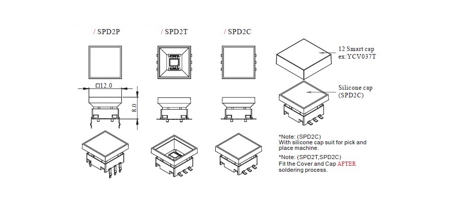 SPD2是SPD系列其中一款,它的作動鈕尺寸是正方形12×12mm,可以搭配尚圃12聰明帽蓋系列。它有插件腳(TH)和貼片式(SMD)兩種端子腳型式。