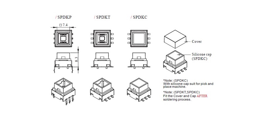 SPDK是SPD系列其中一款,它的作動鈕是SPD系列中最小的尺寸,正方形7.4×7.4mm,只可搭配專屬帽蓋與擴散片,請從HOW TO ORDER中選。它有插件腳(TH)和貼片式(SMD)兩種端子腳型式。
