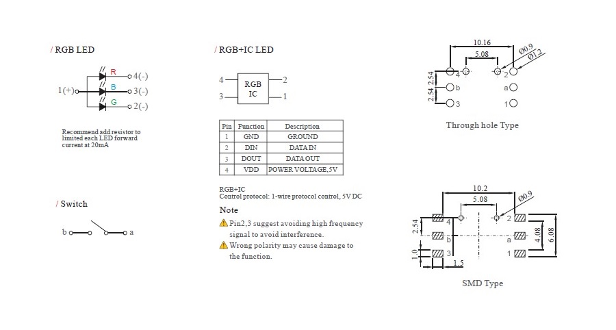 SPD是機械式開關,開關端子腳與LED端子腳是分別獨立的。它帶有一般RGB LED或RGB + IC LED(可尋址LED)的照明開關。它有插件腳(TH)和貼片式(SMD)兩種端子腳提供不同設計及打件製造需求。