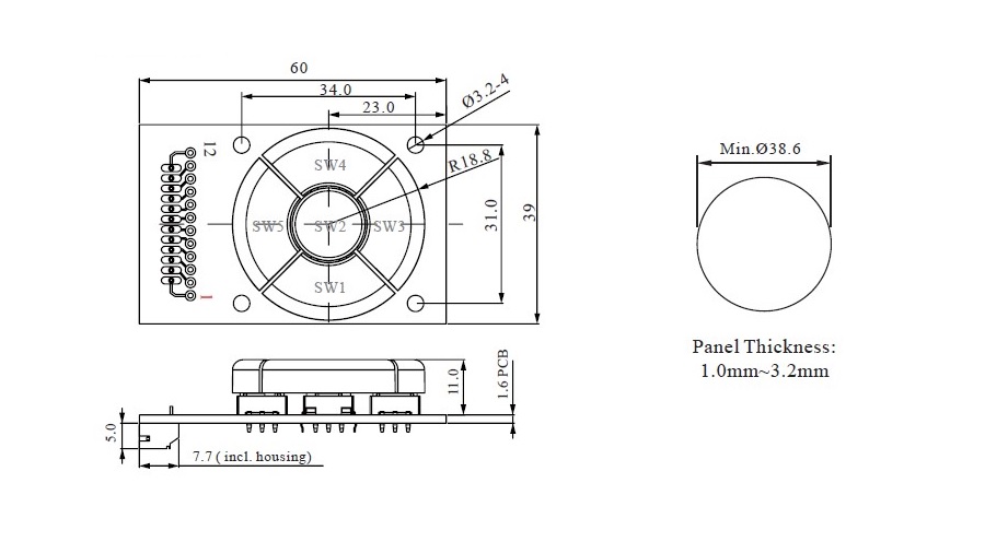 如何使用SPD5K2五向導航按鈕開關?設備面板厚度為1.0mm至3.2mm,最小開孔直徑為38.6mm,裝入並鎖緊螺絲。