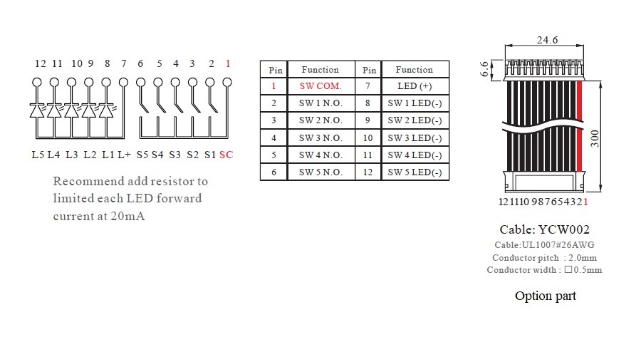 LED和開關的端子接腳是分開的,可以分別設定和控制,LED和開關分別有一個共用腳。一個SPD5K2帶LED燈五鍵導航按鍵開關使用一條YCW002線材連接設備。