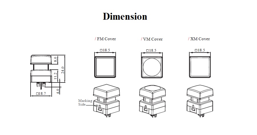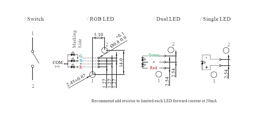 SPG4帶LED燈按壓按鈕開關,開關接點為1、2端,LED端子提供純綠燈、紅綠雙色燈與RGB全彩燈版本,使開發者或工程師能輕鬆整合控制訊號與燈光電路。