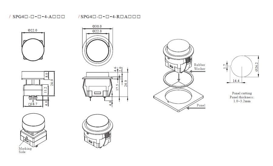 SPG4帶LED燈按壓按鈕開關的圓形款式,上蓋外徑為22.0 mm,安裝時建議面板開孔尺寸為直徑26.2 mm,以確保適當的嵌入空間。面板厚度則建議落在1.0–3.2 mm的範圍內,搭配橡膠墊片可有效提升安裝牢固度,讓操作更穩定可靠。