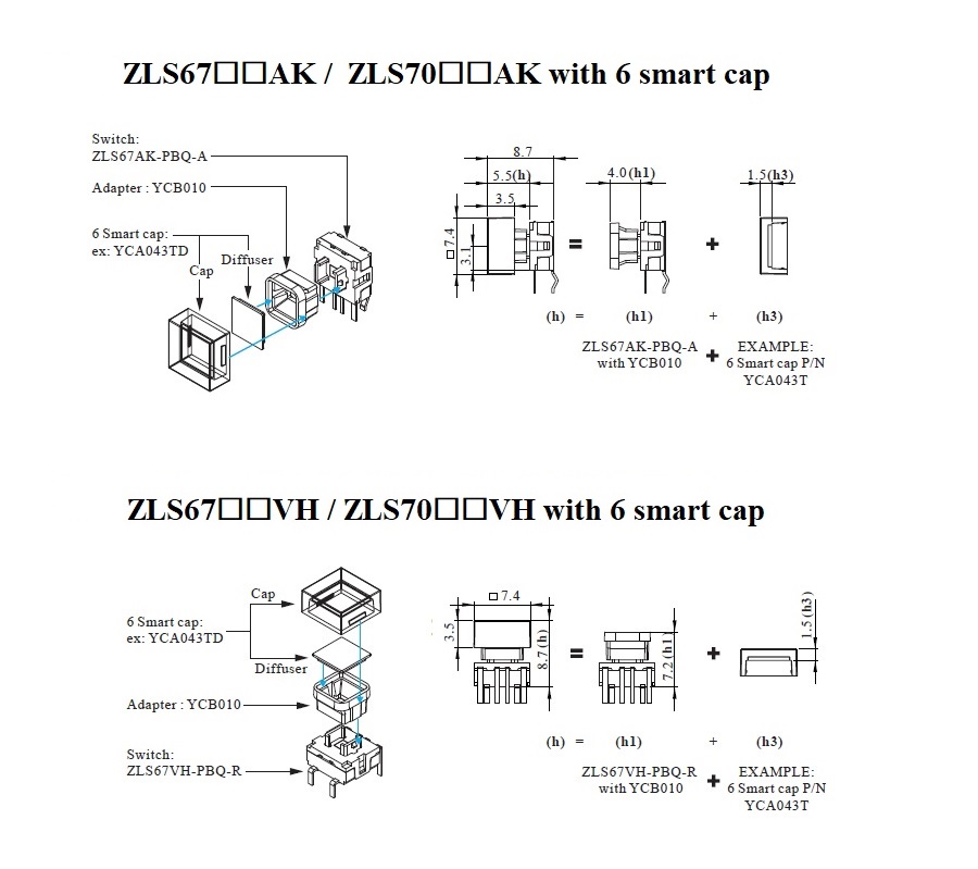 尚圃ZLS67帶LED燈輕觸按鍵開關搭配轉接環YCB010可與6系列聰明蓋(6 smart cap),形成完整的發光按鍵模組,提供均勻亮度與清晰標示。